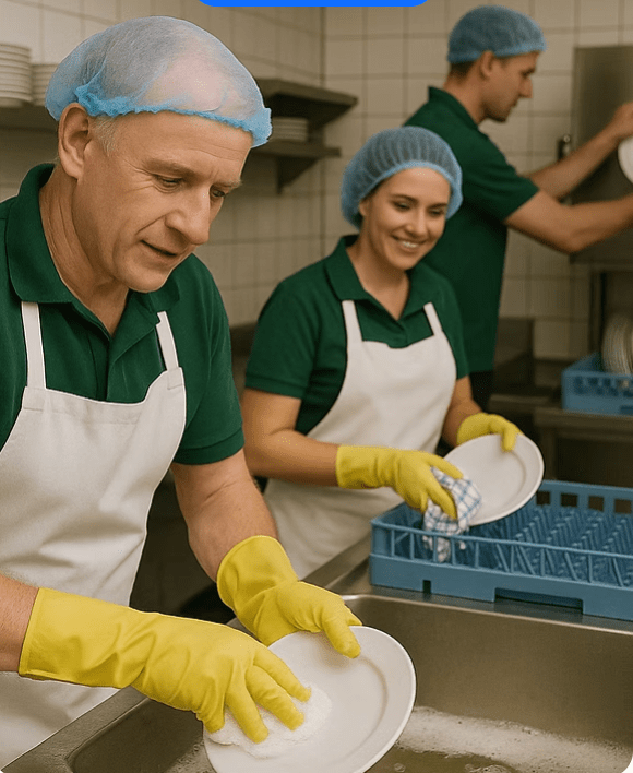 Unterstützung in der Küche durch erfahrene Spülkräfte für schnelle und hygienische Abläufe.